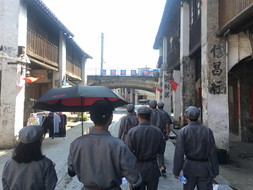 “巍巍南岭,横亘前方,滔滔湘江,奔腾北上。英勇红军,挥师西向,前有强敌,后有虎狼。血肉之躯,铜壁铁墙,全军奋勇,强力破障。前仆后继,势不可当,打通血路,三军过江。数万将士,血洒湘江,为国捐躯,长眠山岗。”这是2014年11月21日,朱德、周恩来、董必武等60多位红军将士的后代及100多位相关部门的同志来到中央红军经过的界首渡口祭奠在红军长征突破湘江的战役中牺牲的革命先烈所编写的湘江祭文中节选的一部分。为了亲身感受革命先辈走过的长征路,继承和传承先烈们不畏艰难险阻、敢于献身的优秀精神品质,7月16日下午,桂林理工大学土木与建筑工程学院兴安“寻红色足迹,走好新时代长征路”实践队从界首中心小学出发徒步前往位于界首的红军长征突破湘江渡江指挥部旧址红军堂感受军旅文化。