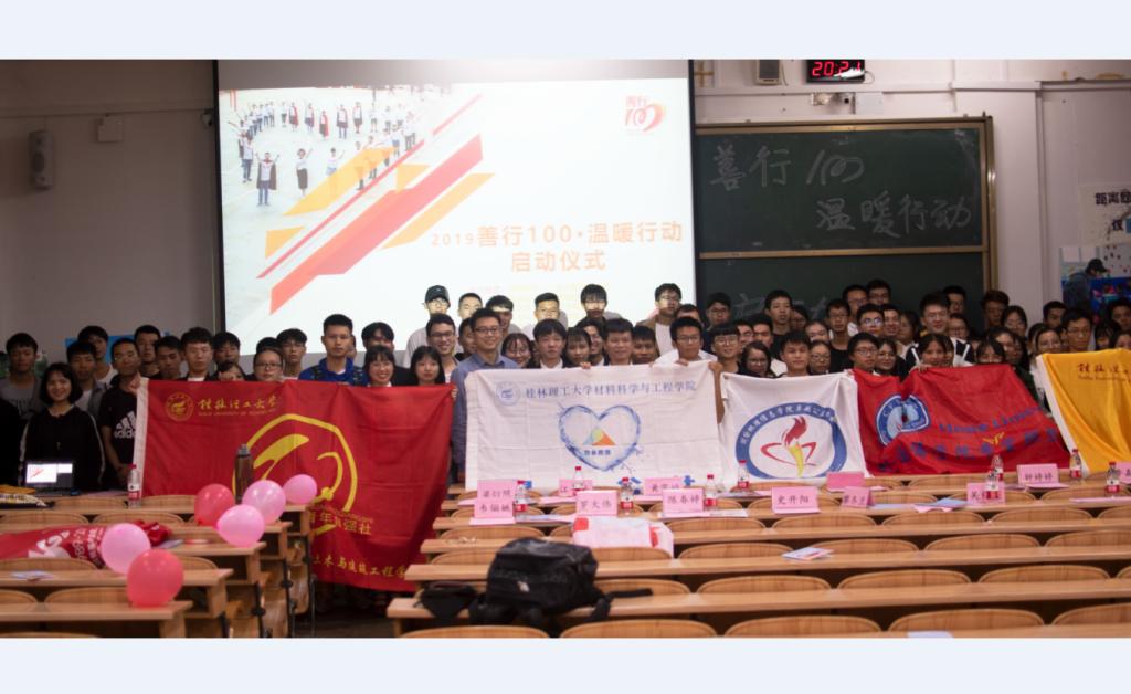10月19日晚,由材料科学与工程学院思源公社,土木与建筑工程学院青年自强社,外国语学院希望联盟,信息科学与工程学院奋斗社,测绘地理信息学院卓越公益协会,机械与控制工程学院扬·爱协会主办的“善行100·温暖行动”启动仪式在桂林理工大学雁山校区06409室举行。