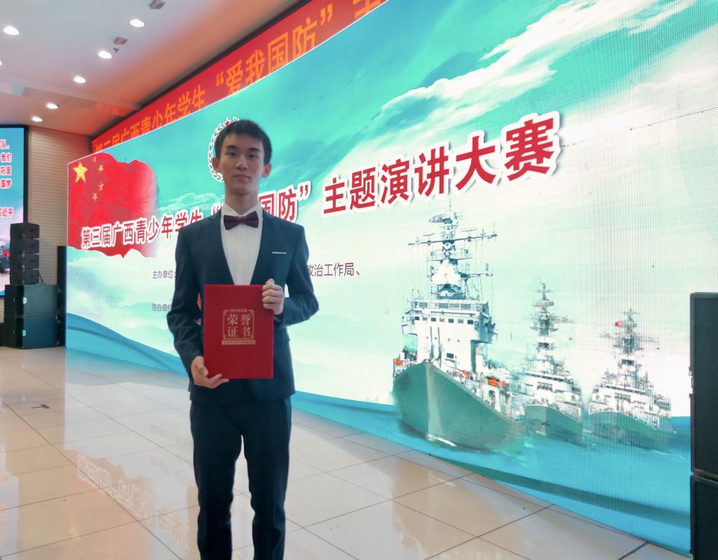 唐昊荣获第三届广西青少年学生“爱我国防”主题演讲大赛优秀奖