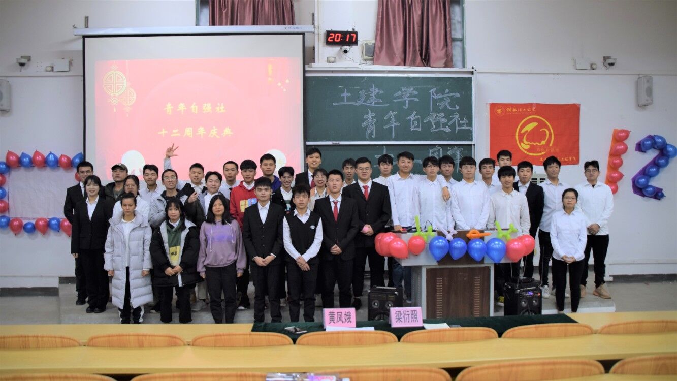 为了推动社团健康发展,弘扬社团文化,增强青年自强社成员之间的交流与了解,营造更加积极有爱的大家庭氛围的目的,表达对青年自强社的祝福与期盼。桂林理工大学土木与建筑工程学院青年自强社于12月28日在雁山校区举办十二周年庆典晚会,青年自强社全体成员参加本次活动。