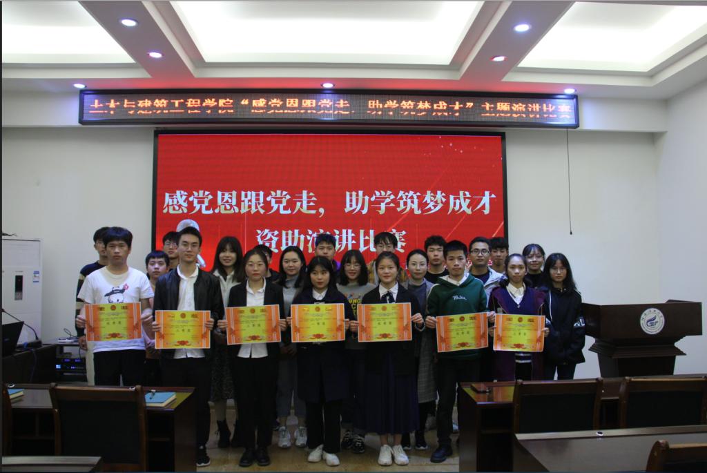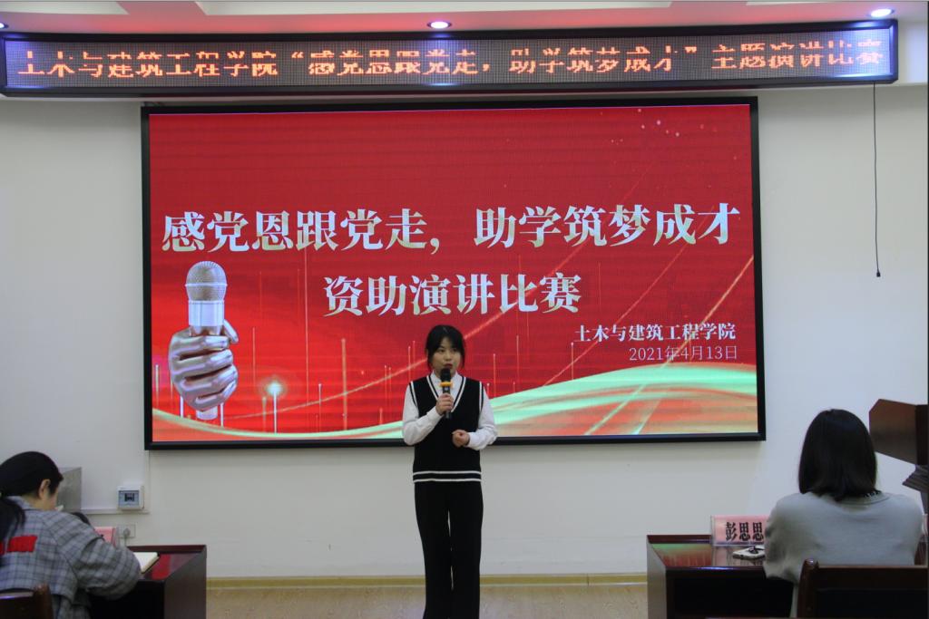 为庆祝建党一百周年,培育受资助学生的爱国爱党情感和感恩意识,进一步推进学院学生资助政策宣传工作,土建学院2021年4月13下午在屏风校区4204教室举行以“感党恩跟党走,助学筑梦成才”为主题的资助演讲比赛,安邦国、彭思思、李明霞、王冕、唐子晴五位老师应邀担任本次活动评委。