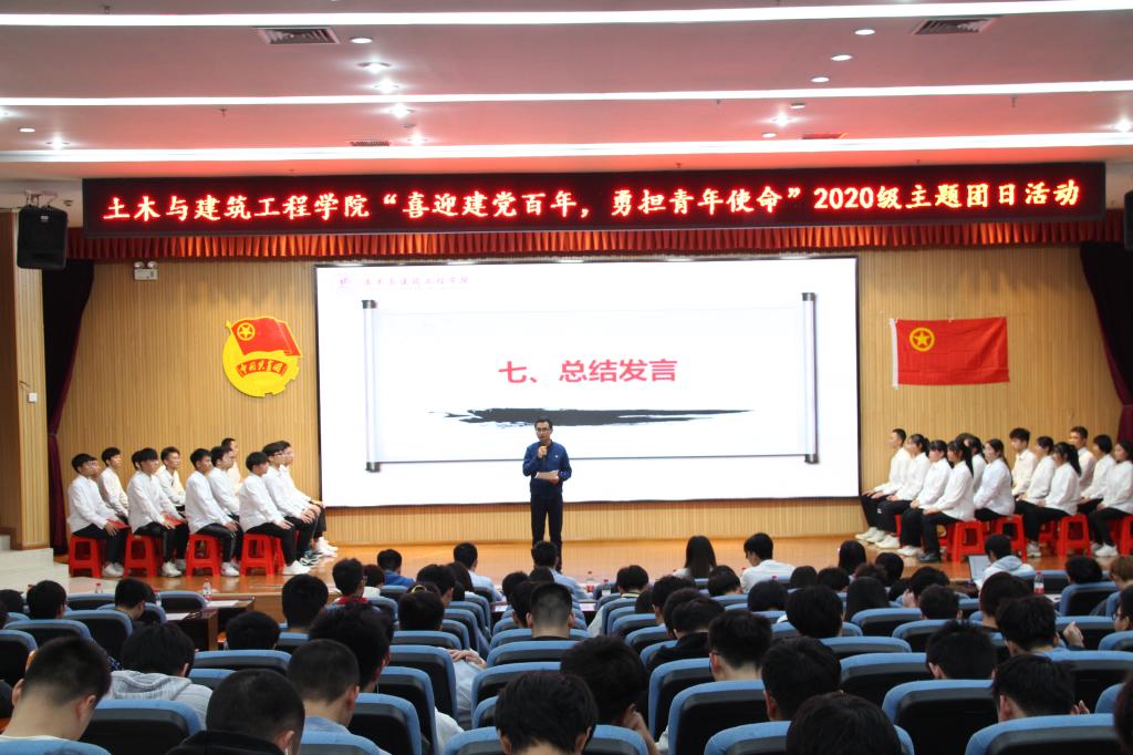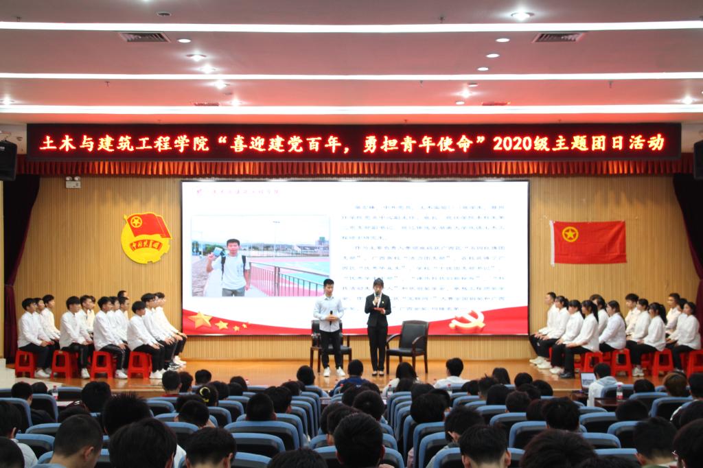 为学习中国共产党波澜壮阔的革命历史,重温革命精神,4月20日由土木与建筑工程学院土木类2020-1班团支部和土木类2020-4班团支部承办的“喜迎建党百年,勇担青年使命”主题大型团日活动在雁山校区图书馆报告厅举行,学院团委副书记安邦国老师、2020级辅导员谢基柱老师、唐子晴老师、2017级学生党员廖宏臻同学以及2020级同学代表参加了本次活动。