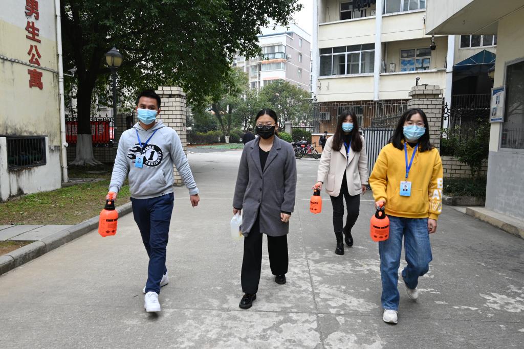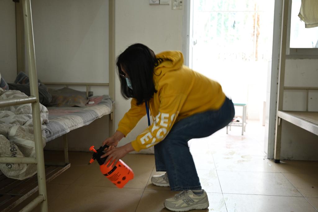 辅导员进入学生宿舍进行卫生消杀