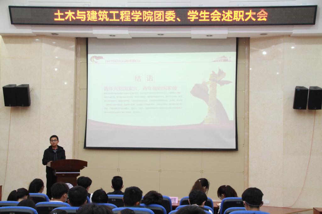 会上,我院团委、学生会11个部门的负责人对过去一年的工作履职情况、取得的工作成效、存在不足及问题、未来工作计划等方面进行工作汇报。随后,学院团委副书记(兼)安邦国老师总结发言,他首先对团委、学生会过去一年的工作成果表示肯定,强调了本次述职大会重在相互交流学习,推进学院团委、学生会深化改革,更好发挥联系广大同学的桥梁纽带作用,要求全体学生干部应具备政治素质、能力素质和团队素质,以高效率、高标准的完成自己的工作职责,做到不忘初心、牢记使命。
