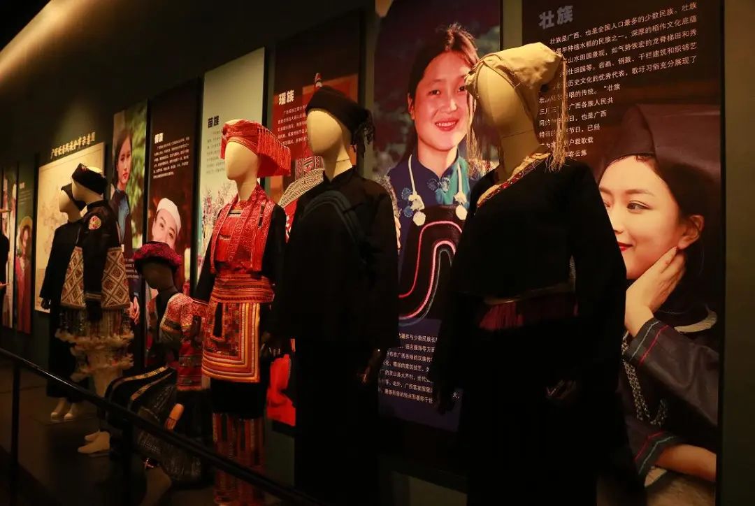 随着经济全球化趋势的加强和现代进程的加快,非物质文化遗产受到越来越大的冲击。国家历来重视文化遗产的保护,弘扬优秀传统文化,为此做了大量的工作,并取得了显著的成效。博物馆也正为人民日益增长的美好生活需要提供丰富的文化食粮,在博物馆三楼,我们见到了传统文化与现代艺术相结合的成功典范——霓裳羽衣,此展览通过新的陈列方式展现新的面貌,解读了八桂大地上斑斓多彩的民族文化艺术。“当年菡萏初露的小家碧玉经历十年沉淀,而今她凤舞归来,芳华绽放!”霓裳羽衣展区的这句话赫然在列,让我们感受到了穿越千年的女性之美。