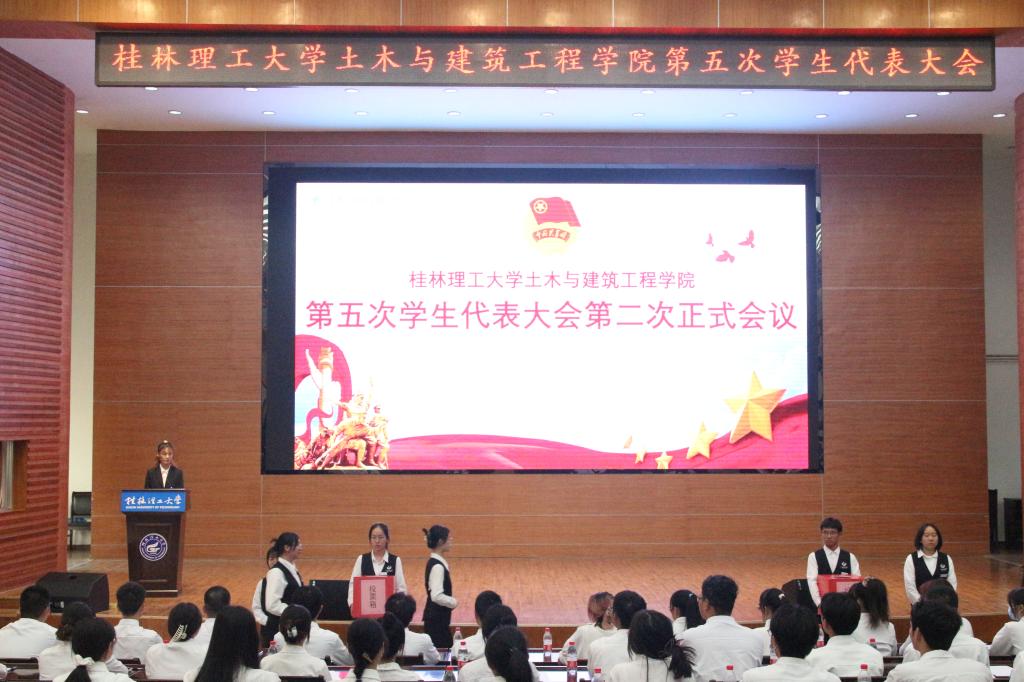 第二次全体代表会议上审议并通过《桂林理工大学土木与建筑工程学院学生会章程(修正案草案)》、《桂林理工大学土木与建筑工程学院学生会章程(修正案草案)》、《桂林理工大学土木与建筑工程学院第五次学生代表大会选举办法(草案)》、《桂林理工大学土木与建筑工程学院第五次学生代表大会监票人、计票人名单》;介绍并选举学生会主席团成员。根据大会选举和计票结果,胡材添和许承辉2名同学当选为土木与建筑工程学院学生会第五届主席团成员。本次大会在全体人员的团歌歌声中落下帷幕。