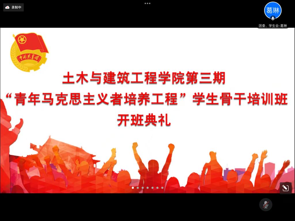 为深入学习贯彻党的二十大精神,以及习近平总书记关于对青年工作的重要讲话精神,扎实推进土木与建筑工程学院青年马克思主义者培养工程,我院于11月30日在线上开展第三期“青年马克思主义者培养工程”学生骨干培训班开班典礼,学院团委副书记安邦国老师、2021级辅导员张绪婷老师老师以及培训班全体学员参加了本次典礼,开班典礼由院团委办公室负责人葛琳主持。
