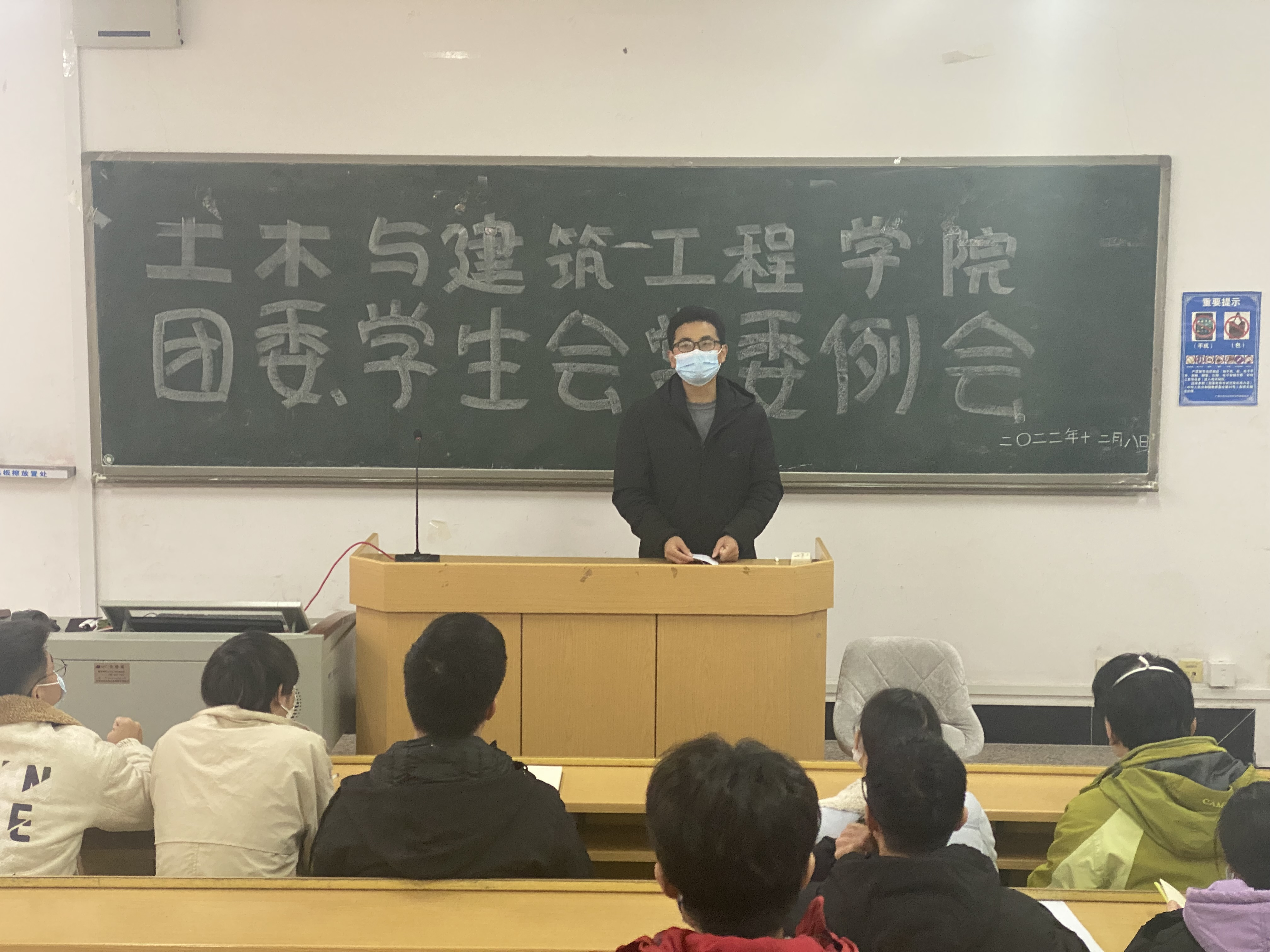 12月8日中午,土木与建筑工程学院团委、学生会第15周常委例会在屏风校区9113会议室召开,安邦国老师、张绪婷老师、张宇博老师以及团委、学生会2021级成员出席本次会议。