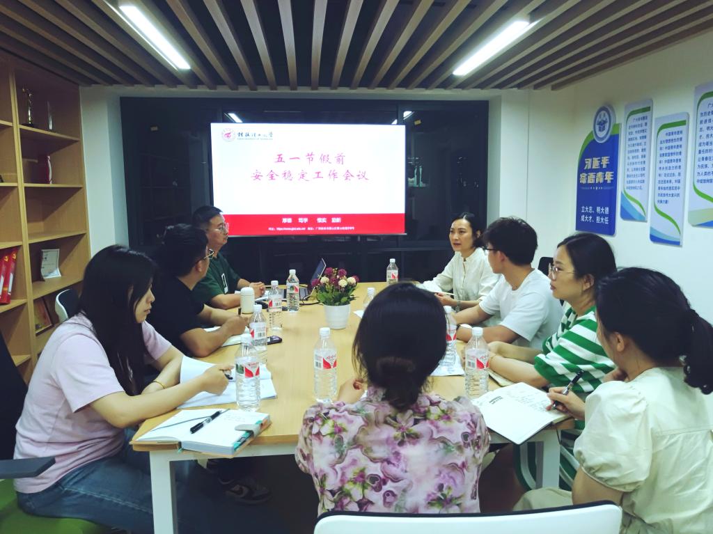 会上,学院党委副书记徐时传达了学校近期安全稳定工作会议精神,分析研判了当前学院学生安全稳定工作形势,对“五一”假期学生安全稳定等相关工作进行了详细的部署,强调学院全体专兼职辅导员要切实提高政治站位,牢牢绷紧校园安全这根弦,做好假期学生安全教育和管理工作。一是要摸清学生假期去向,畅通学生、家长联系渠道,做好假期每日安全“零汇报”工作;二是要做好校园安全隐患排查,重点围绕宿舍、实验室等场所环境卫生、用电安全、汛期安全、消防安全等内容开展自查并及时上报整改;三是要加强校园安全宣传教育,结合“大学生成长成才课”“主题班会”活动和学院融媒体平台加强教育宣传, 重点针对防溺水、防诈骗、交通安全、旅游安全、心理健康、意识形态安全等内容开展教育引导,提高学生的防患意识和应急处置能力;四是要严格执行假期值班值守制度,加强校园安全巡查,保持通讯畅通,提高应急反应能力,确保学生生命财产安全和校园安定稳定。
