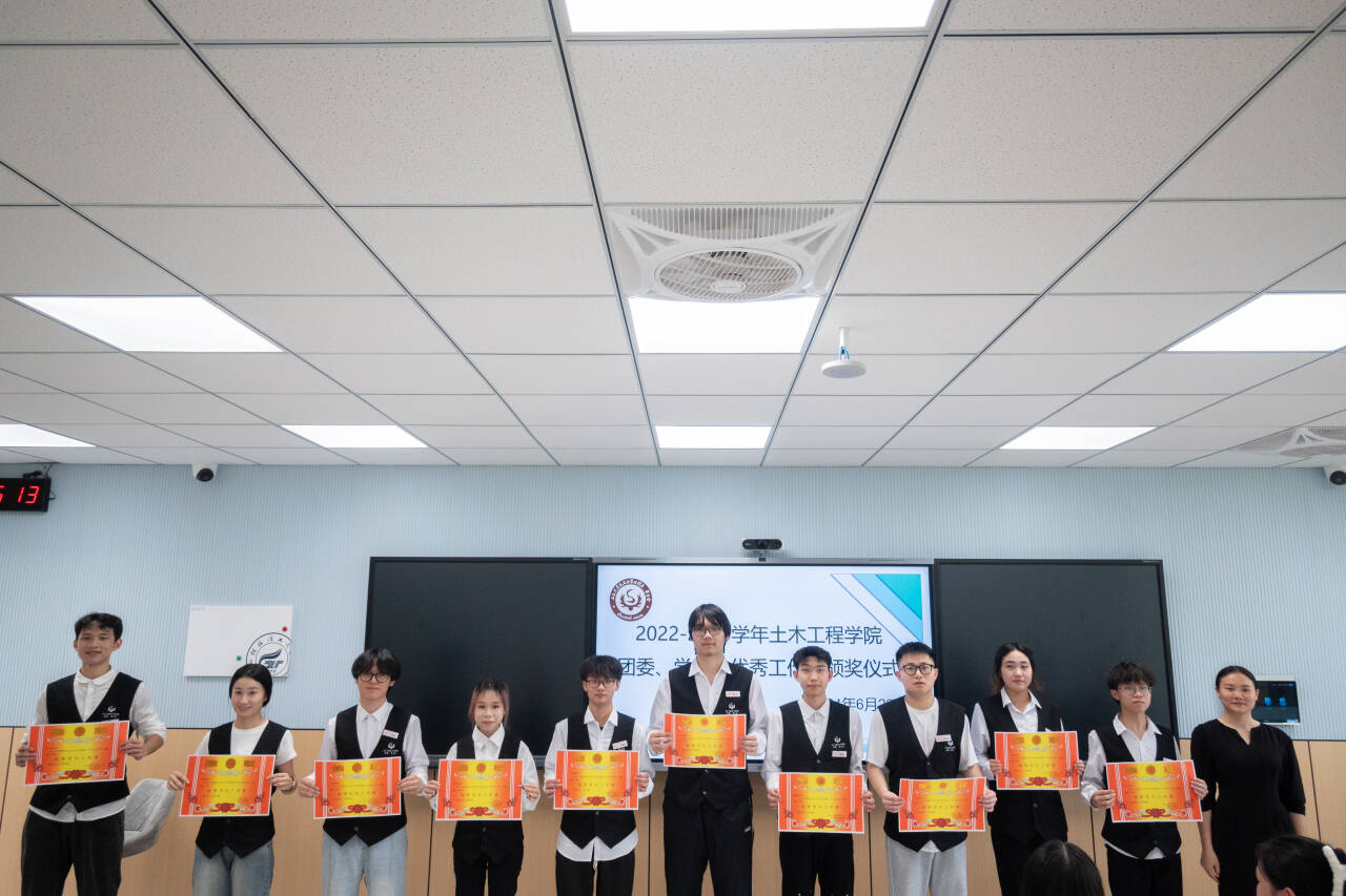 会议伊始,各个部门代表逐一上台进行工作述职,他们总结了这一学年来本部门的工作成绩,分析了工作产生的问题并反思不足,同时简述了问题的解决方案以及今后的发展方向。述职汇报结束,团委学生副书记陈玉芹对述职大会的开展进行了评议,希望各部门成员在汇报期间能够更加注意细节。最后,学院团委书记张绪婷老师宣读了2023年度土木学院团委、学生会优秀工作者名单并颁发证书。张绪婷老师鼓励同学们要以优秀工作者为榜样,勤奋努力,打造一支本领强、业务精的学生干部队伍。