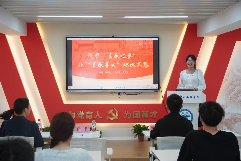 商学院吕铭茵分享了在青春路上挺膺“请党放心,强国有我”的忠诚之姿、“攻坚克难,迎难而上”的实干之姿、“念兹在兹,枝叶关情”的担当之姿,号召同学们以奋斗姿态激扬青春,用坚毅的品格、顽强的斗志、奉献的精神谱写自强的人生。