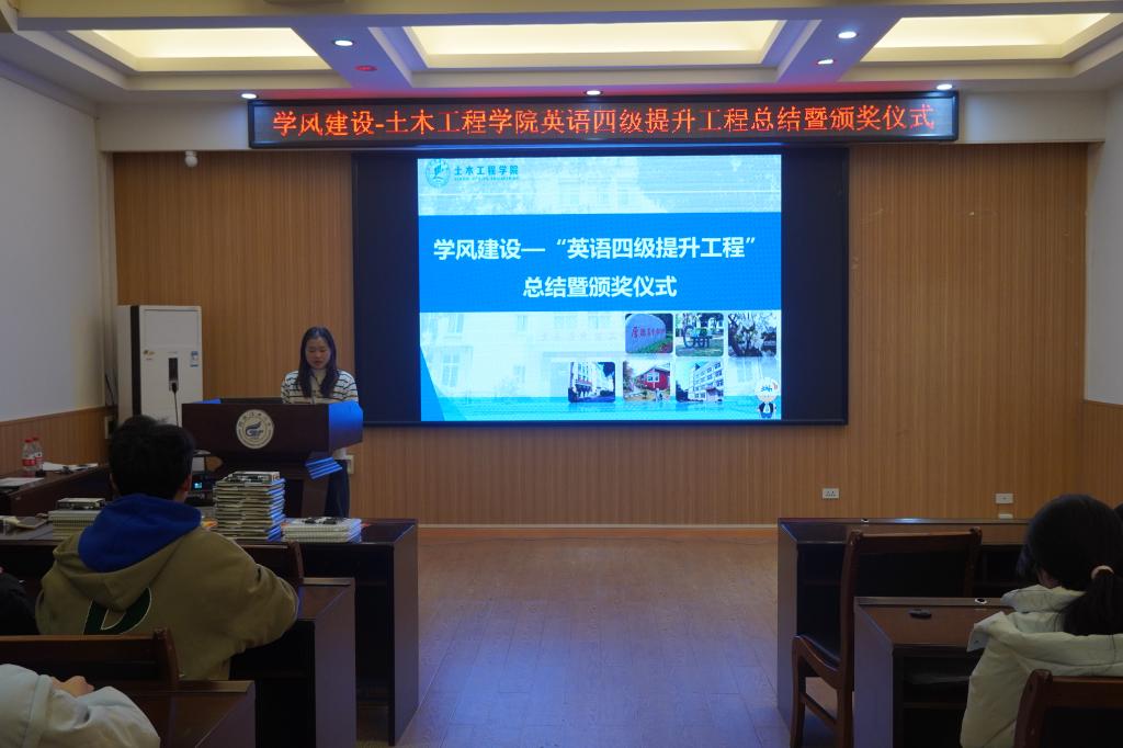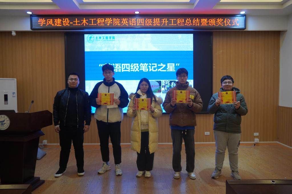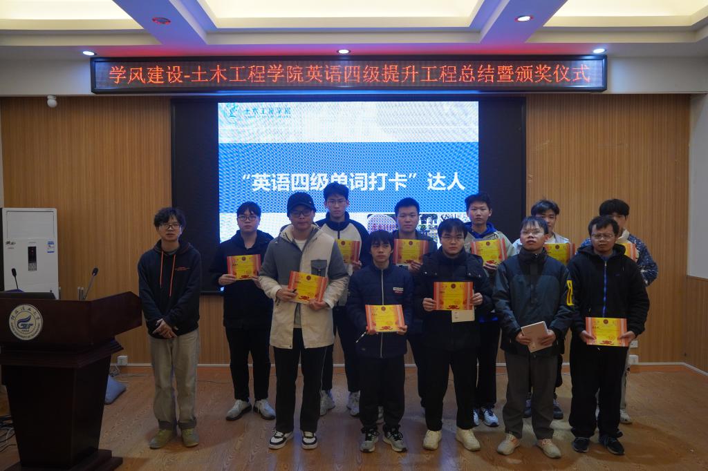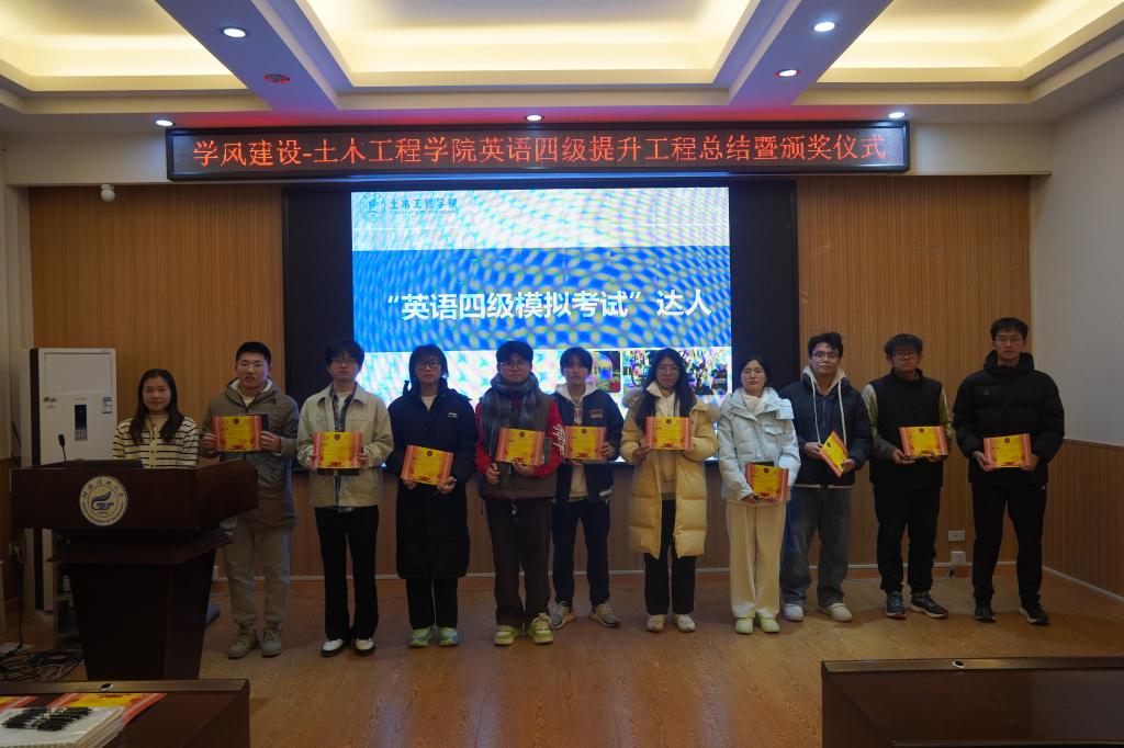 为激励学生积极投身英语学习,提升学院英语四级通过率,彰显榜样力量,土木工程学院于12月13日在4204教室举行英语四级提升工程总结大会暨颁奖仪式。本次活动旨在回顾学院在四级备考方面的努力成果,为即将参考的学子加油助威,推动学院学风建设迈向新高度。