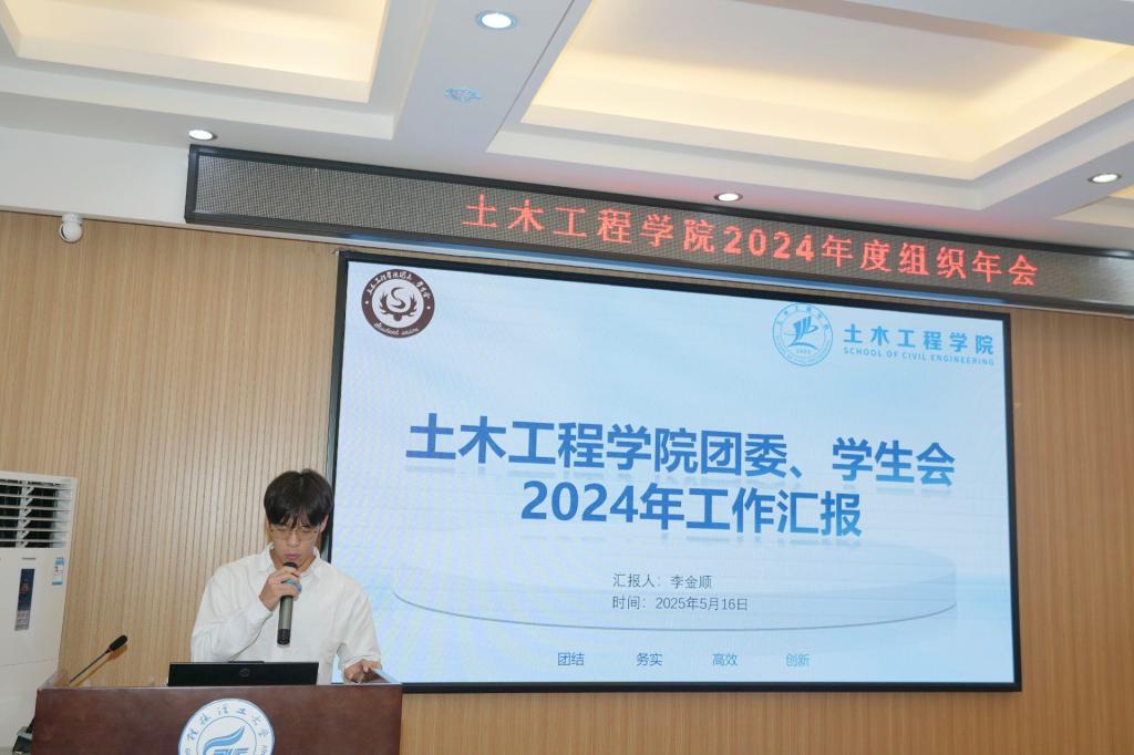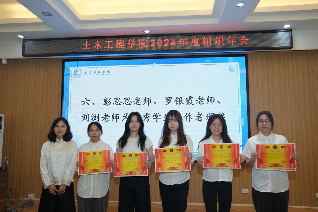 各学生组织依次上台进行答辩与成果展示,全面汇报了在服务同学成长、推动学院发展中的务实举措与创新成果,用扎实的工作成效诠释了“全心全意为同学服务”的宗旨。学院团委副书记张绪婷老师宣读《关于表彰土木工程学院2024年度“优秀学生工作者”的决定》,表彰了一批在学生工作中表现突出的个人工作者,彭思思、罗银霞、刘浏三位老师为优秀学生工作者颁发荣誉证书,李林军老师为获奖组织和协会颁发“优秀组织奖”奖状,激励各团队以先进为榜样,不断提升工作水平。最后,李林军老师结合新时代青年使命与学院发展需求做总结发言。