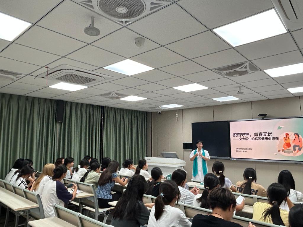为提升女大学生健康素养,普及科学保健理念,2025年10月15日晚,学院在雁山校区05202教室举办“疫苗守护·青春同行”女大学生健康专题讲座。桂林市妇幼保健院妇女保健科主任谢玉梅受邀主讲,为学院2025级全体女同学带来一堂生动的宫颈健康必修课。学院2025级辅导员张绪婷、赵超然及全体2025级女生参加活动。
