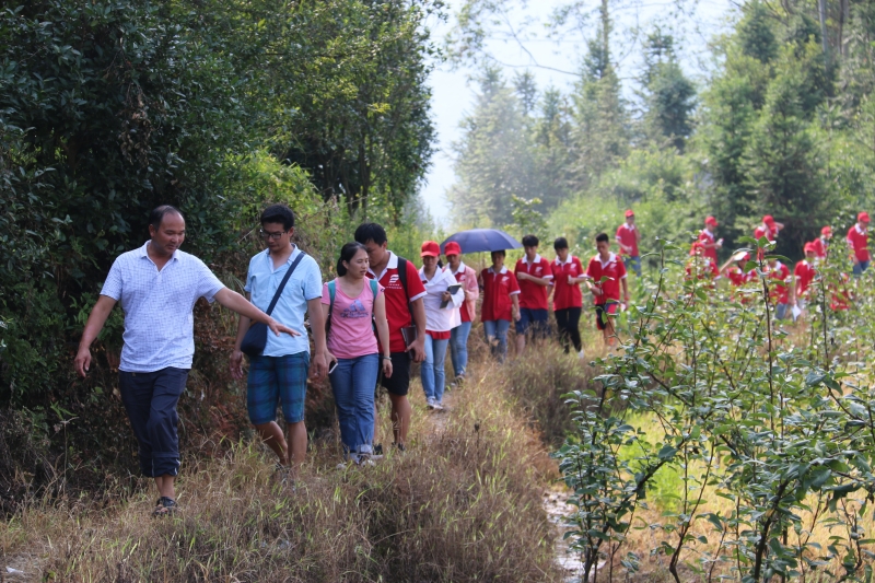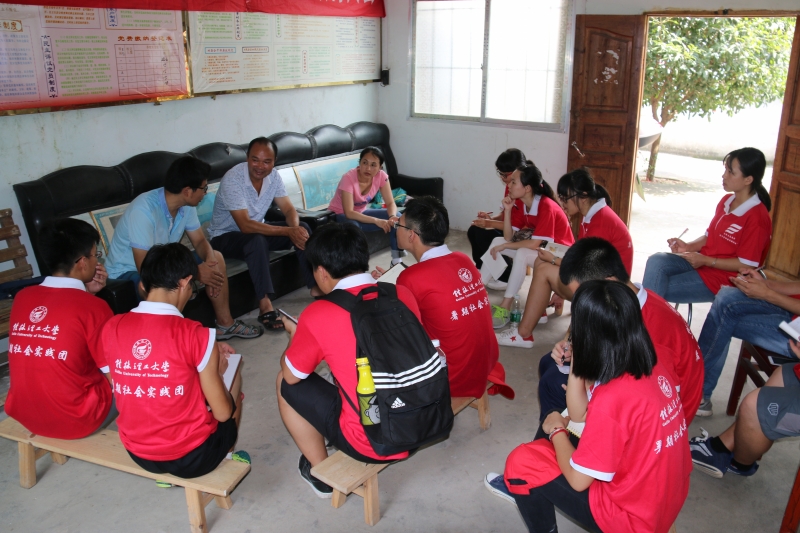 座谈会一开始,王主任首先介绍了东阳村基本情况,他说:我们是贫困村,有着相当数量的贫困户,我们需要加强基础设施的建设和产业革新来改变小山村贫困落后的既面貌。他提到该村的产业发展规划和村庄布局规划等方面还具有存在一定的问题,并希望得到实践团同学的建议与指导。同时希望同学们能利用所长为该村设计村公所的办公楼以及周边的环境规划和村旁河道的拦水坝设计。随后王主任还带领实践团成员进行实地考察,在路经过一条稻田沟渠边的小路时,王主任说目前该村有十几个小学生每天往返两趟经过这里来上学,下雨天时小孩子经常掉到摔到田埂边的沟渠中,但由于经费不足无法修建一条水泥硬化的小路供孩子们上学用。