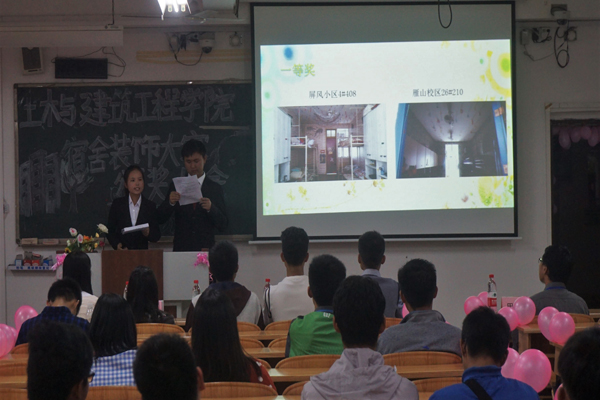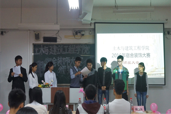 11月4日晚上,由我院宿舍管理委员会举办的宿舍装饰大赛颁奖大会在雁山校区06401教室隆重举行。出席本次大会的嘉宾有土建学院辅导员陈宣东、学生会主席蓝智勇、青年自强社社长崔炎宗、材料学院社区成长工作营主任覃聪、宿管委主任田昕炜,同时2016级各宿舍代表也参加本次大会。