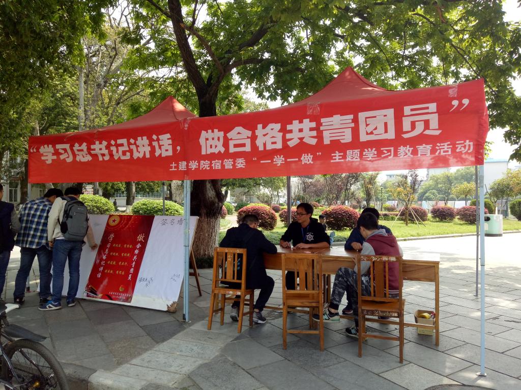 为了落实“一学一做”的思想,建设文明和谐的校园,我院宿管委于4月13日上午10:00在屏风校区开展以“学习习近平总书记讲话,做合格共青团员”为主题的宣传活动。4月14日晚上19:30在雁山校区06302教室召开“一学一做,做合格共青团员”的学习会,2016级各班的生活委员参加了此次会议。