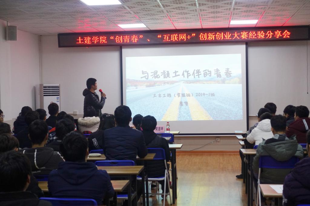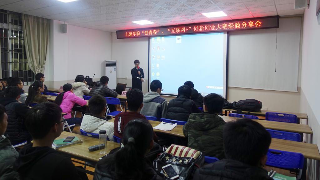 为进一步激发学院学生创新创业意识,提高学生创业实践能力。12月28日晚,由学院主办,土木工程(应用)2016-6班承办的“土建学院‘创青春’、‘互联网+’创新创业大赛经验分享会”在屏风4203会议室成功举办。本次分享会邀请到了建筑工程14级詹贺、15级周敏,道路桥梁15级李启石,16级实验班李轲轲给大家分享自己在参加创新创业项目的成功经验。2016级辅导员黄道坤以及学院90余名同学参加了此次分享会。