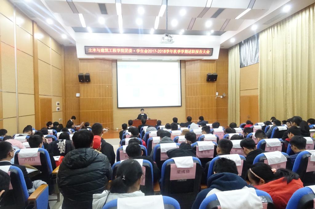 1月7日,土建学院团委·学生会在雁山校区12栋报告厅举行了2017-2018秋季学期述职大会。学院团委书记唐丽华、2015级辅导员安邦国及学院各社团、班级代表参加此次活动。