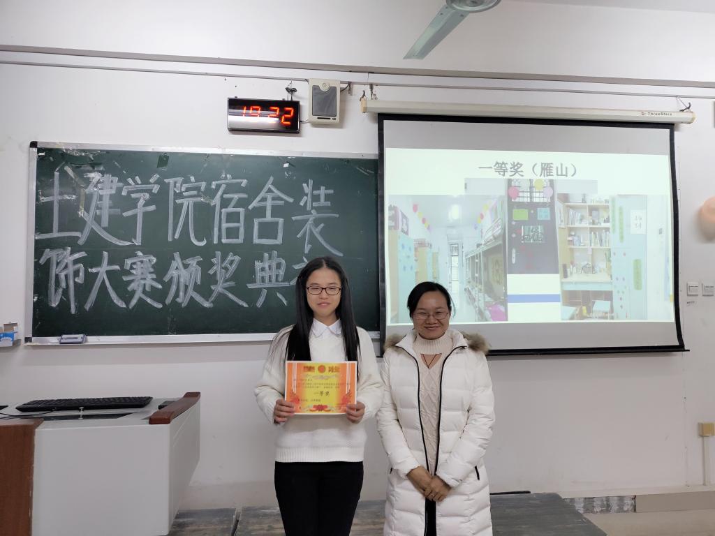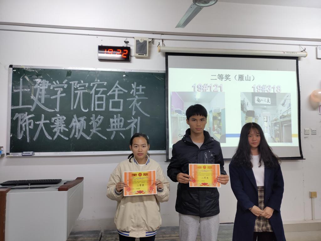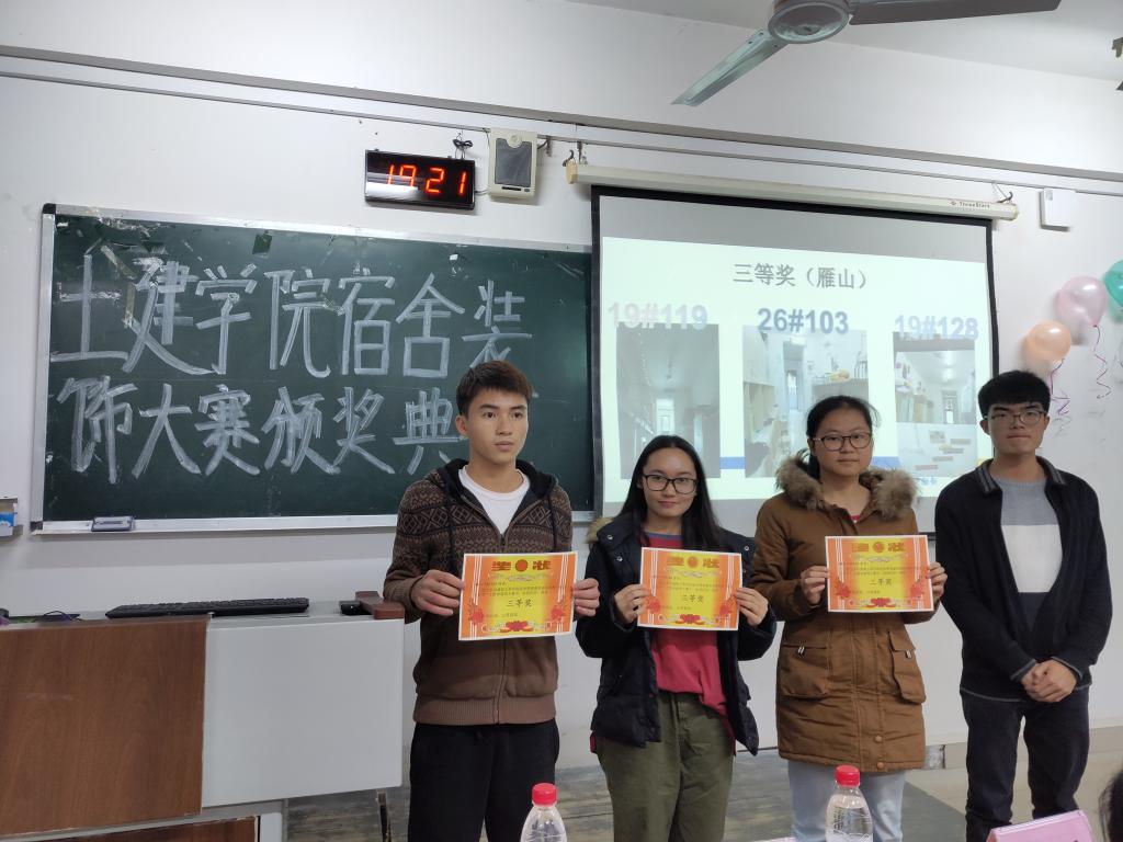 经过评审团的评比及综合各方面的考量后,颁奖典礼于12月18日晚在雁山校区05203教室进行。一等奖花落屏风校区的1#516和雁山校区的19#118;二等奖为屏风3#302,3#401和雁山19#318,19#121;三等奖为屏风2#210,7#402,7#203和雁山19#119,26#103,19#128。同时还颁发了最佳布局奖,最佳色彩奖,最佳环保奖,最佳创意奖,最佳解说员等。典礼还邀请到了黄观媛老师,黄老师阐述了此次宿舍装饰大赛活动的得失,进一步说明了此次活动目的在于增进宿舍成员之间的沟通交流,打造更好的小家。