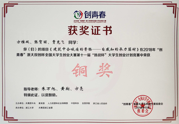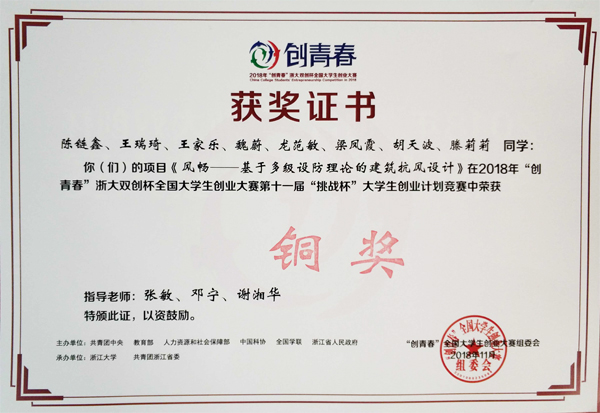 2018年“创青春”浙大双创杯全国大学生创业大赛终审决赛在浙江大学落下帷幕。经过激烈角逐,我院《风畅——基于多级设防理论的建筑抗风设计》(指导老师:张敏、邓宁、谢湘华)、《建筑中会喊痛的骨骼——自感知力的承力筋材》(指导老师:朱万旭、黄湘、方亮)两个项目斩获了“创青春”国赛铜奖。参赛获奖,不仅激起了其他学生对创新创业的热情,更是对学校双创教育工作的肯定。