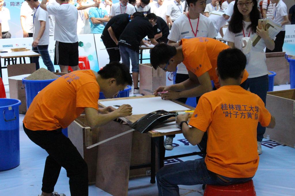 我院组建的“叶子方黄”队参加了决赛阶段的比赛,参赛队员来自土木工程专业道桥方向2014级的本科学生。他们经过半年的准备,在指导老师王志兵老师的带领下进行了设计参数确定、设计报告的撰写和挡墙模型试验,并根据现场比赛用材情况调整设计方案,在规定时间内依次完成了筋材剪裁、墙面板制作、筋材和墙面板的粘贴连接、模型施工和加载环节。团队凭借设计报告书得分、筋材轻质量、墙面小变形等优异表现获大赛三等奖。