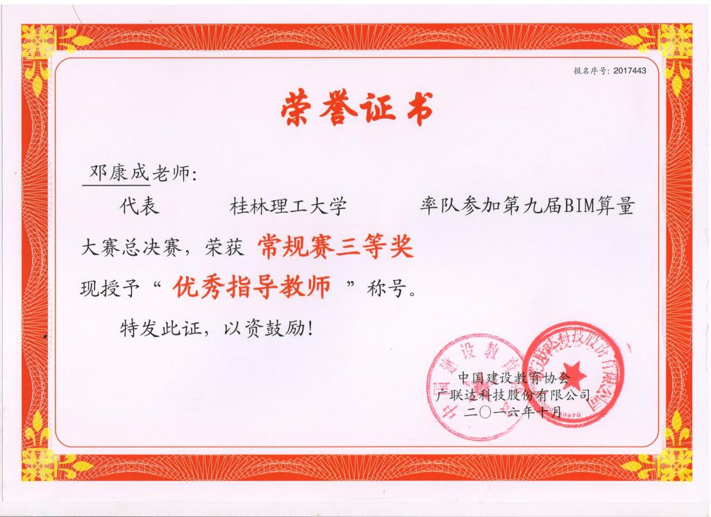 邓康成老师荣有“优秀指导教师”称号
