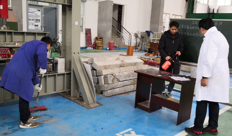 根据近期学校新冠疫情防控会议精神及学院的工作要求,2021年 11月23日上午,我院建筑工程检测与实验中心组织相关老师对所有实验室进行全面防疫消杀工作。大家用含氯消毒剂擦拭喷淋消毒,消毒后保证开门开窗通风一段时间,消毒部位主要包括实验台、仪器柜、门、窗台、墙角、地面等。在消杀工作中,全体教师都以高度的责任心认真对待,力争做到不留死角。通过本次防疫消杀工作,为我院师生的教学科研实验场所提供了有力的健康保障。