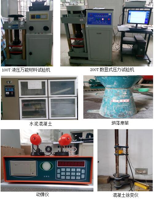 本实验室拥有350型混凝土搅拌机、混凝土收缩测定仪、混凝土动弹性模量测定仪、混凝土徐变仪、混凝土振动台、水泥混凝土标准养护箱、100T液压万能材料试验机、200T数显式压力试验机等。