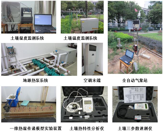 本实验室配有土壤热特性分析仪,土壤三参数速测仪(介电常数、电导率、温度),全自动气象站,土壤温度监测系统,土壤湿度监测系统,热泵运行状态监测系统,地源热泵系统空调末端,一维热湿传递模型实验装置,地源热泵热交换系统传热模拟实验台,恒温实验工作间等。