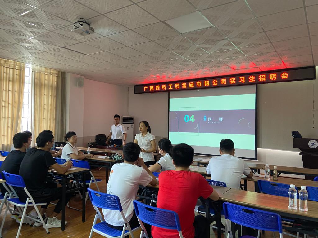 2020年7月1日下午,广西路桥工程集团有限公司来我院4203会议室进行2021届毕业生实习招聘。宣讲会由我院学院党委副书记唐丽华主持,2017级辅导员张宇博、李明霞参加。
