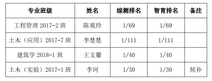 根据上级和学校有关文件要求,我院2019-2020学年度国家奖学金院内推荐工作已经完成,经学生个人申请,班主任、辅导员推荐,学院国家奖助学金评审小组研究,拟推荐学生4名,其中候补学生1名。现将院级拟推荐名单公示如下,公示期为5个工作日。
