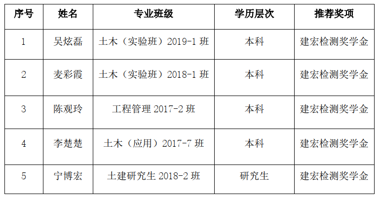 根据《桂林理工大学“建宏检测奖学金”评定办法》和《关于开展桂林理工大学2020年“建宏检测奖学金”评定工作的通知》,经学生个人申请,学院学生工作领导小组根据评审条件进行认定,现将推荐参评人员名单进行公示,结果如下: