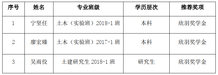 根据《桂林理工大学“欣羽奖学金”评定办法》和《关于开展桂林理工大学2020年欣羽奖学金评定工作的通知》,经学生个人申请,学院学生工作领导小组根据评审条件进行认定,现将推荐参评人员名单进行公示,结果如下: