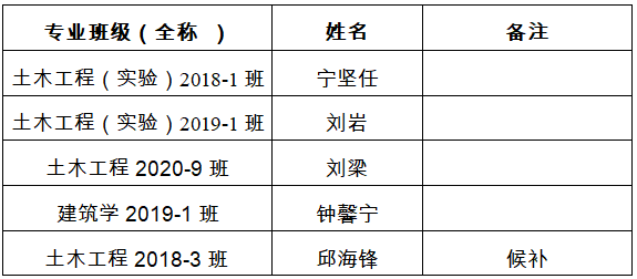 土木与建筑工程学院2020-2021学年度国家奖学金根据上级和学校有关文件要求,我院2020-2021学年度国家奖学金院内推荐工作已经完成,经学生个人申请,班主任、辅导员推荐,学院国家奖助学金评审小组研究,拟推荐学生5名,其中候补学生1名。现将院级拟推荐名单公示如下,公示期为3天。