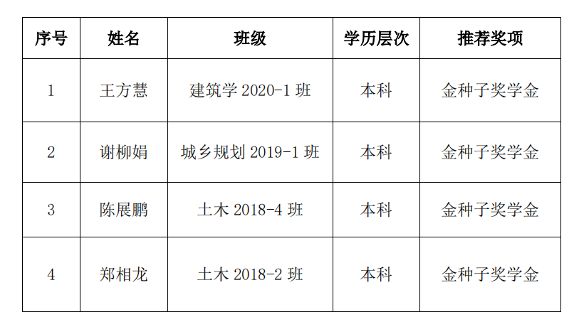 根据《桂林理工大学校友“金种子奖学金”评定办法》和《关于开展桂林理工大学2021年校友“金种子奖学金”评定工作的通知》,经学生个人申请,学院学生工作领导小组根据评审条件进行认定,现将推荐参评人员名单进行公示,结果如下: