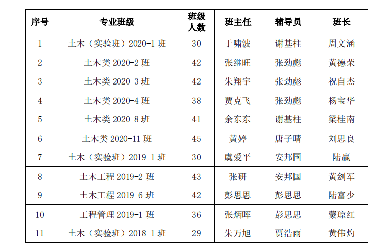 根据《桂林理工大学“优良学风班”创建考评办法》(桂理工学〔2017〕40号)文件精神,在班级申报,学院学生工作办公室审查并推荐的基础上,2020——2021学年度“优良学风班”评选已评审完毕,拟推荐11个班级参加校级评选,现将名单予以公示,公示期3天。从2021年11月3日至11月5日。具体名单如下: