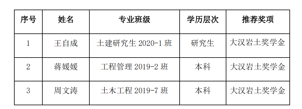 根据《桂林理工大学“大汉岩土奖学金”评定办法》和《关于开展桂林理工大学2022年大汉岩土奖学金评定工作的通知》,经学生个人申请,学院学生工作领导小组根据评审条件进行认定,现将推荐参评人员名单进行公示,结果如下: