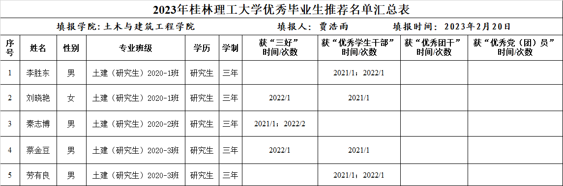 根据《关于做好2023年桂林理工大学优秀毕业生评选工作的通知》文件要求,按照公开、公平、公正、择优的原则,经学生本人申请、学院学生工作领导小组审核确定,现将我院2023年桂林理工大学优秀研究生毕业生评选结果予以公示(排名不分先后)。