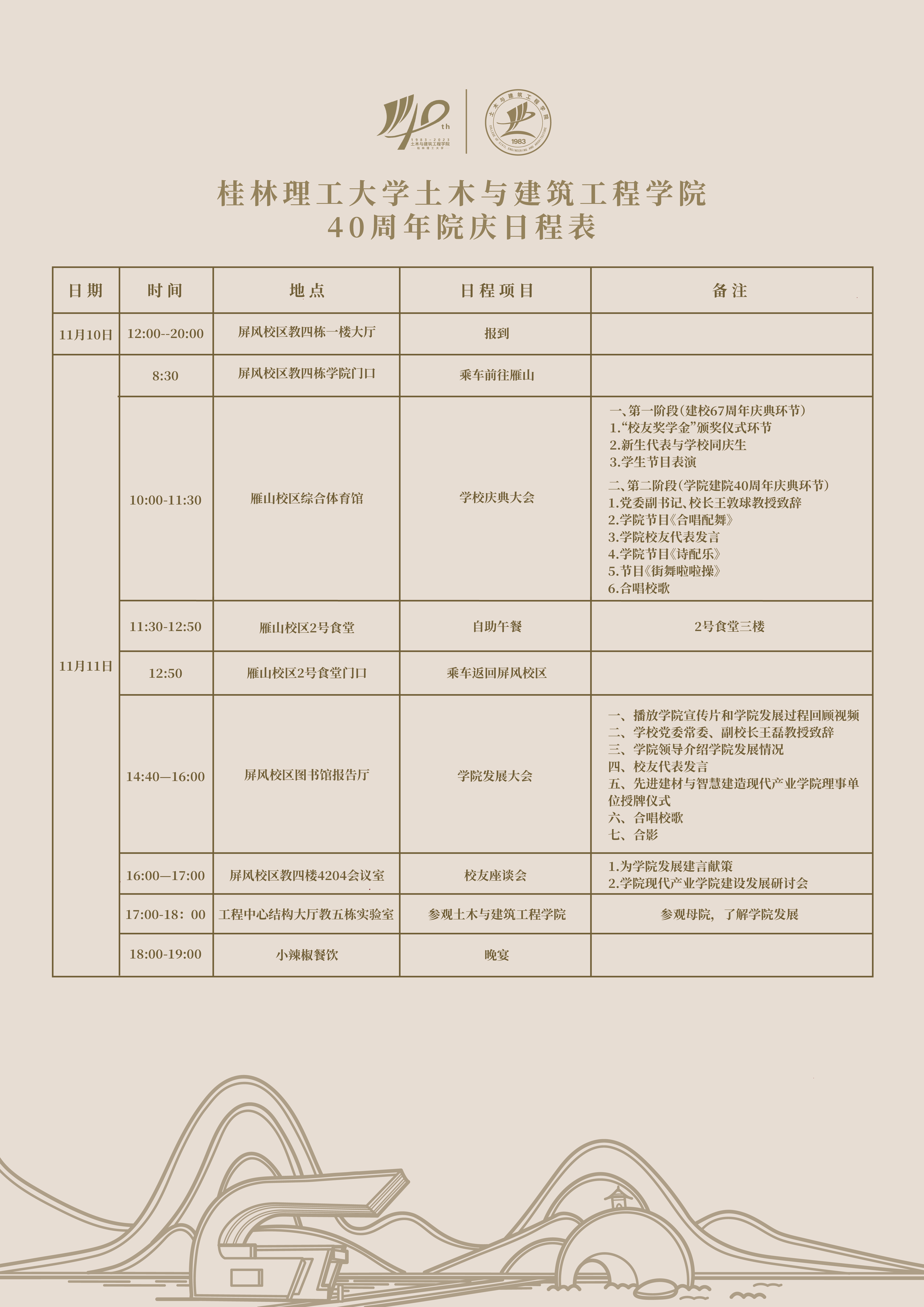 2023年11月11日是桂林理工大学建校67周年暨土木与建筑工程建院40周年的喜庆日子,以下是院庆40周年活动日程,诚邀各位师生参加,共同庆祝这个重要而有意义的日子!