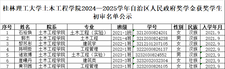 根据上级和学校有关文件要求,我院2024—2025学年自治区人民政府奖学金评审工作已经完成,经学生个人申请,班主任、辅导员推荐,学院国家奖助学金评审小组研究,共推荐学生7名。现将初审获奖名单公示,具体名单如下,公示期为2024年9月24日—9月26日,如有异议,请以书面形式,并署真实姓名和联系电话,于公示期结束前向学院学生奖助学金评审小组反映。