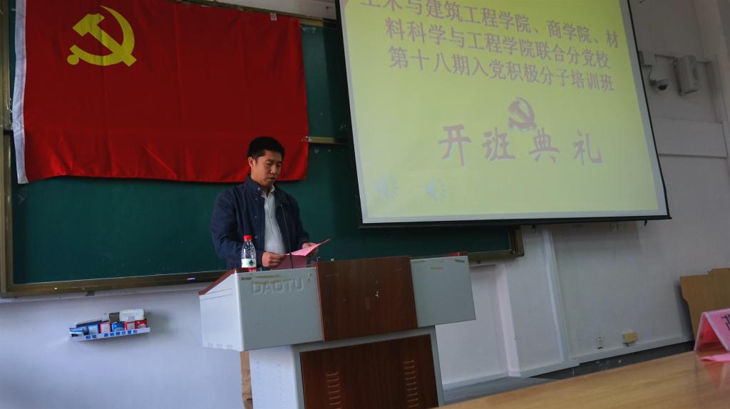 为了深入学习党的十九大知识,贯彻习近平总书记系列重要讲话精神,提高入党积极分子的党性修养,土木与建筑工程学院、商学院、材料科学与工程学院联合分党校第十八期入党积极分子培训班(雁山校区)3月30日中午,于雁山校区06207教室举办了入党积极分子培训班开班典礼。土木与建筑工程学院党委副书记、党校副校长王盛老师,商学院2017级辅导员张雪老师、材料科学与工程学院辅导员宇文霖老师出席了此次开班典礼,典礼由土木与建筑工程学院辅导员马文硕老师主持。