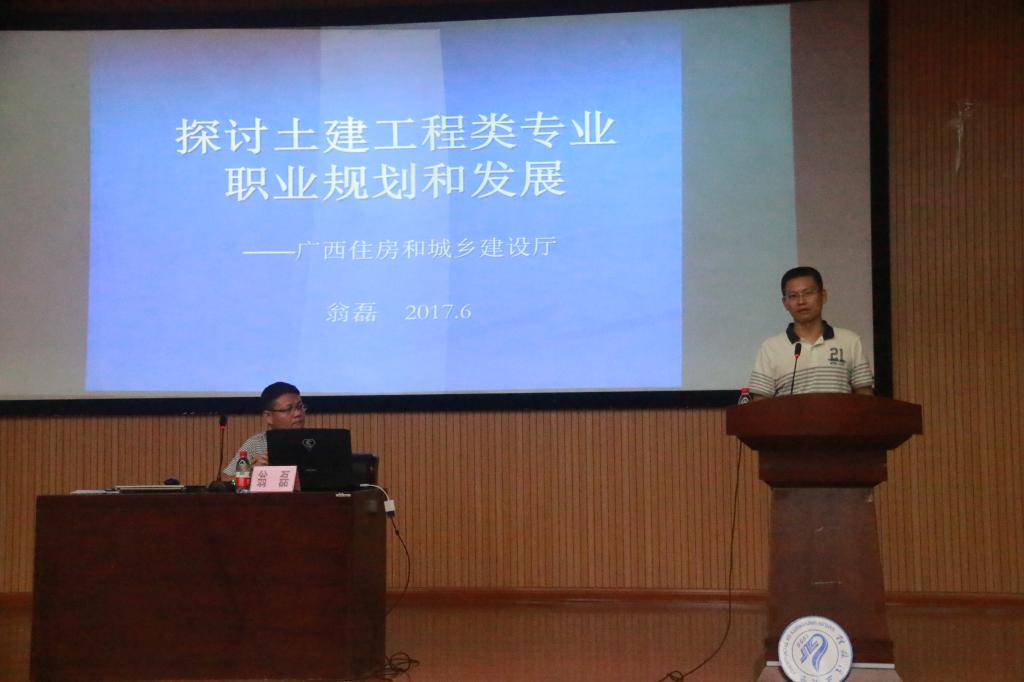 6月3日下午,由广西住房和城乡建设厅翁磊工程师在雁山图书馆报告厅为我院2016级土木工程专业学生作了题为 “探讨土木工程职业规划和发展”专题讲座。出席本次讲座的嘉宾有冯广辉老师、蒋玄老师等。