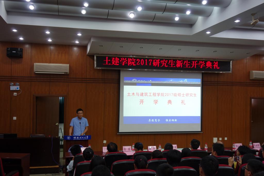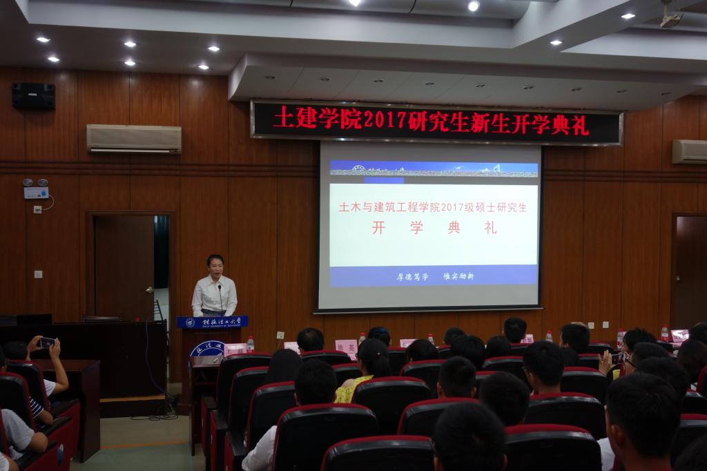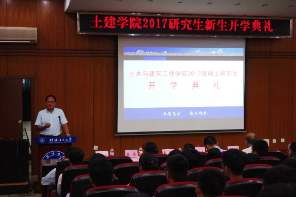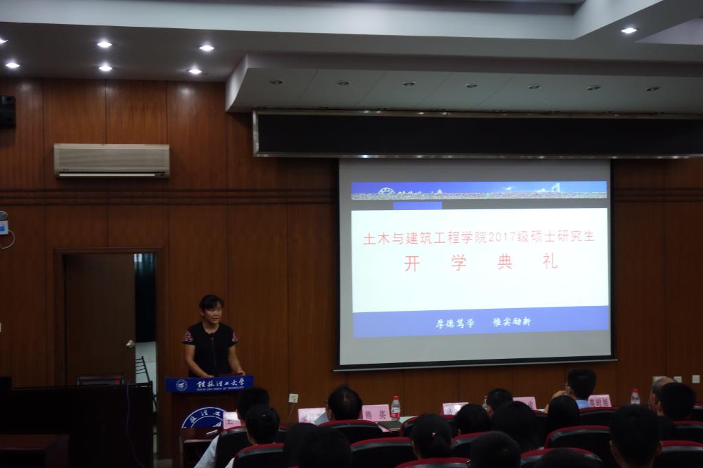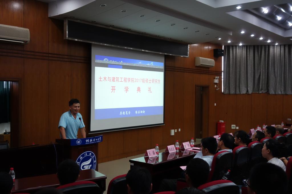首先,学院党委书记熊英代表学院欢迎2017级新生的到来,并介绍学校和学院的历史与发展现状,表达了对同学们的殷切期望。而后,导师代表刘之葵教授发言。刘老师从先做人后做学问,并且要做有诚信的学问方面对新生们提出要求和希望;希望他们要勤学勤想,锐意进取,始终把科研放在心中,将来学有所成做社会有用的人。随后,2016级学生代表章明明同学代表发言,他表达了对师弟师妹们的热烈欢迎,同时也希望新一届师弟师妹能继续发扬桂工精神,不断超越自我,有所建树。接着,2017级新生代表汤沁同学发言。她表达了初入桂工的喜悦之情,以及希望同学们能够坚定理想,树立目标,秉承“厚德笃学,惟实励新”的校训,在学习路上开拓进取。开学典礼的最后,韦昌富院长总结致辞。韦院长从作为一名研究新生首先应从学习心态的转变开始告诉新生们:究生阶段的学习不同于本科,你们不再只是知识的被动接受者,而将成为自然规律的探索者和文化奥秘的发现者。学术研究是研究生培养的一种主要方法,你们当中一部分人的学术研究生涯或许就从这里起步。他希望新生们树立清晰而恒久的目标,笃信坚持和耐心的力量,认定自己前进的方向,矢志不渝,在专注中成就自己的未来。
