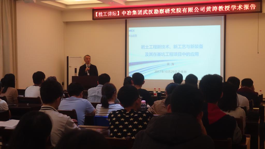 10月29日下午两点,中冶集团武汉勘察研究院黄涛教授在4204进行题为“岩土工程新技术、新工艺与新装备及其在基坑工程项目中的应用”的学术讲座,我院研究生积极参会。报告会由学院朱寿增教授主持。