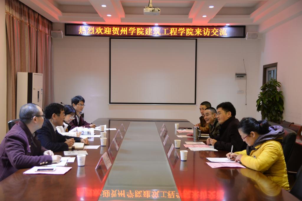 2017年11月27日上午,贺州学院建筑工程学院党总支书记陈勇一行四人来学院交流,学院副院长王磊、学院副院长赵军、学院院长助理虞爱平、学院学工组组长宋明霞与来访客人在屏风校区4222会议室进行了座谈交流。