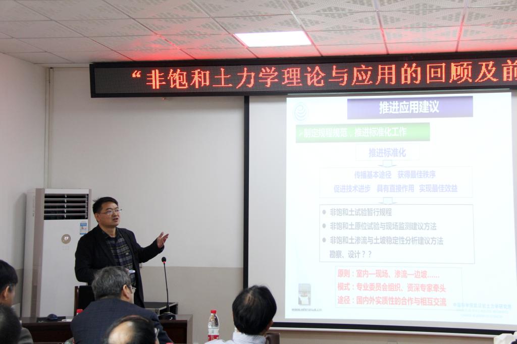 本次学术研讨会主要是非饱和土力学理论为背景。针对于这一问题,中国人民解放军后勤工程学院陈正汉教授发表了题为“非饱和土力学发展——历史与展望“的报告,报告系统地阐述了非饱和土力学的建立、发展过程,并且以此为基础展望了未来非饱和土力学理论的发展方向。紧接着,西安理工大学邵生俊教授和上海大学的孙德安教授从试验技术手段及试验规程方面介绍了目前非饱和土力学的发展现状。最后,中国科学院武汉岩土力学研究所孔令伟研究员倡导非饱和土力学理论不应该只停留在理论研究方面,应该工程应用化,并且提出了相应的推广建议。