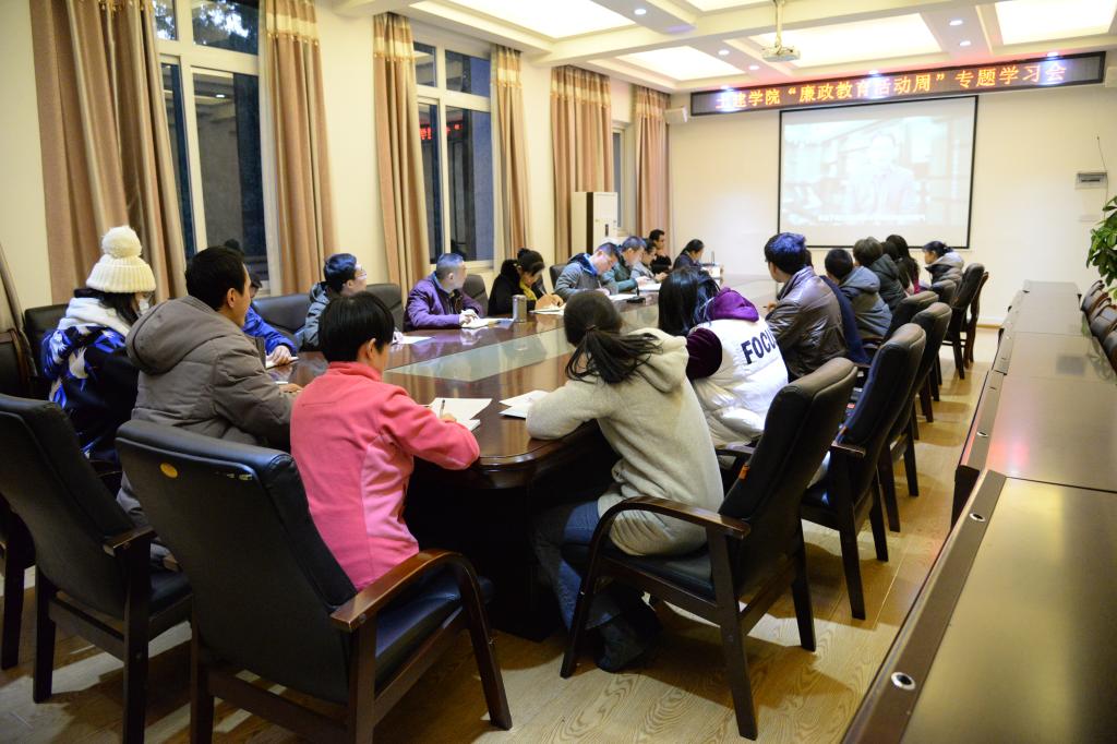 为深入贯彻落实党的十九大精神和习近平总书记关于党风廉政建设和反腐败斗争系列重要讲话精神,结合学校2017年秋季学期“廉政教育活动周”安排,学院于12月20日下午召开了党委中心组(扩大)党风廉政专题学习会。学院党委委员、工会委员、教师党支部书记、学工办和院办教师参加了学习,学院党委书记熊英主持会议。