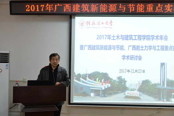 12月23日下午,2017年土木与建筑工程学院学术年会暨广西建筑新能源与节能、广西岩土力学与工程重点实验室学术研讨会在我校屏风校区4203会议室召开。我校陈学军副校长出席了本次会议并致辞,会议由广西建筑新能源与节能重点实验室副主任王磊教授主持,科技处莫凌云副处长,土建学院余文成副院长和虞爱平院长助理,广西岩土力学与工程重点实验室副主任刘之葵教授以及相关师生近百人参加会议。会议还邀请了武汉大学刘数华教授和扬州大学杨卫波教授做特邀报告。