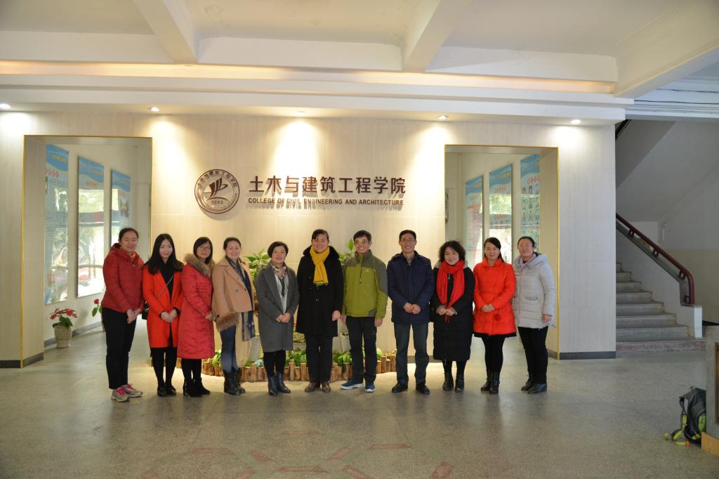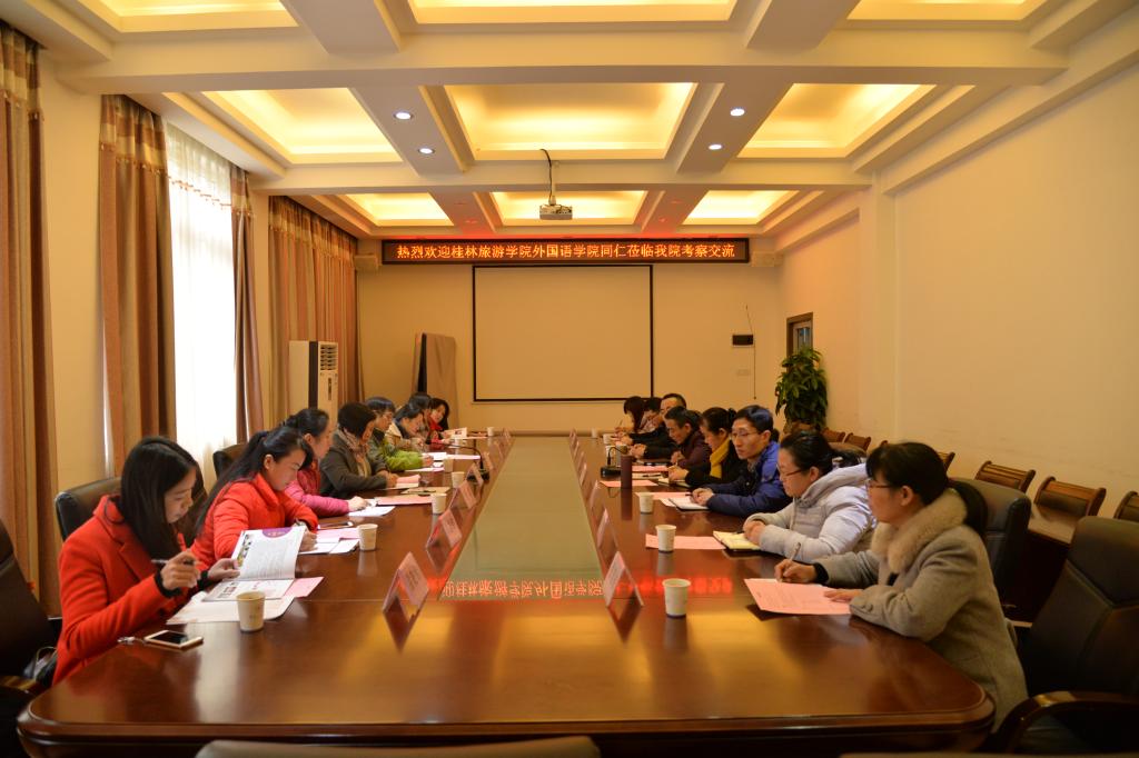 2017年1月12日上午,桂林旅游学院外国语学院学院副院长梁永飞、党总支副书记韦登山一行八人来学院交流,学院党委书记熊英、学院副院长赵军、学院副院长余文成,及工民建教研室、岩土教研室、学工办、院办等均派老师参加交流会,学院与来访客人在屏风校区4222会议室进行了座谈交流。